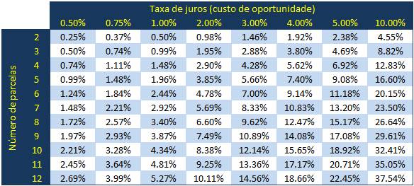 Com esse dado na mão, você vai na linha do número de parcelas, e vê o desconto que corresponde ao seu custo de oportunidade.